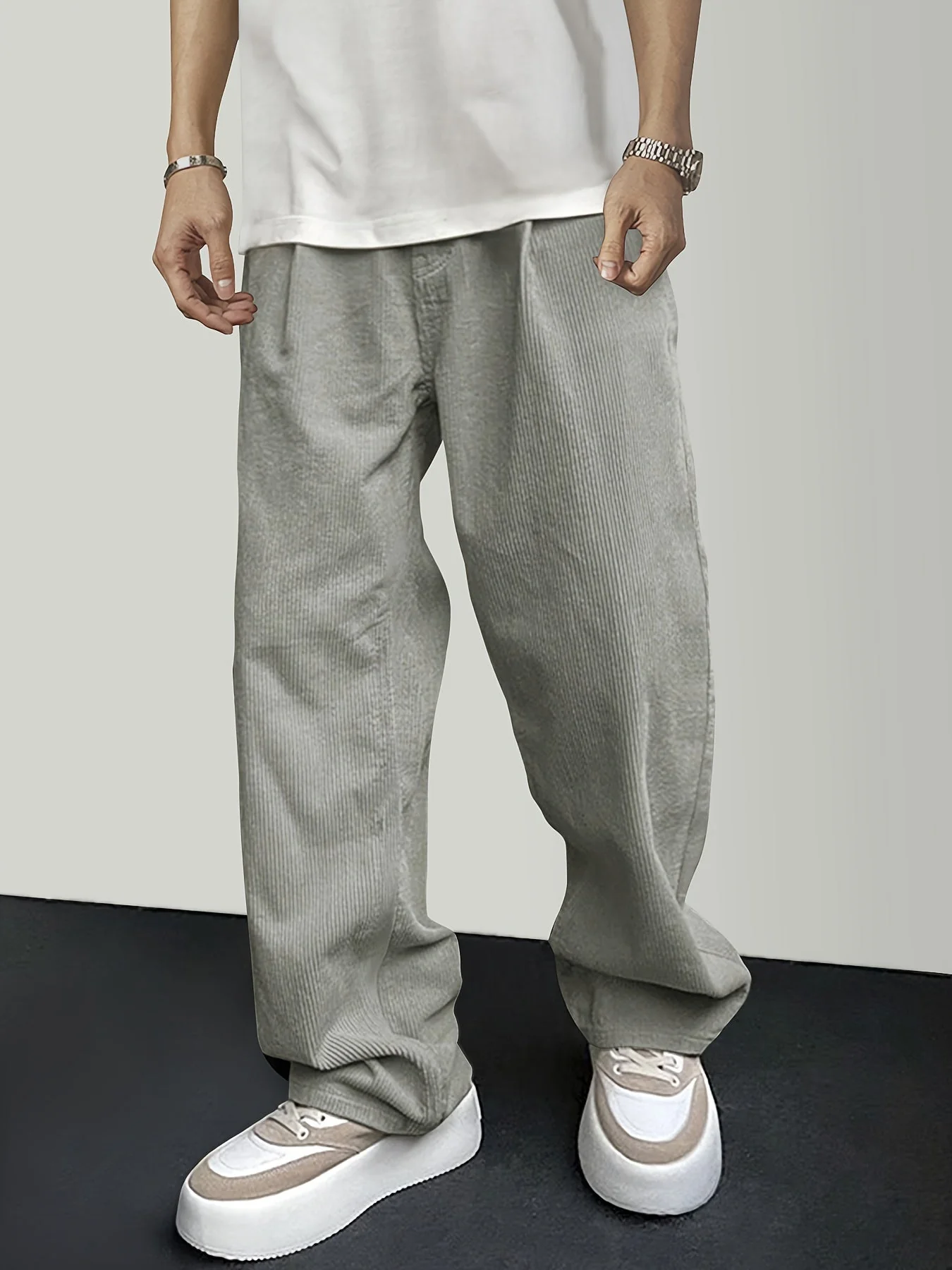 Pantalón casual – Color sólido – Pana de poliéster con cierre de cordón – Perfecto para el fin de semana casual