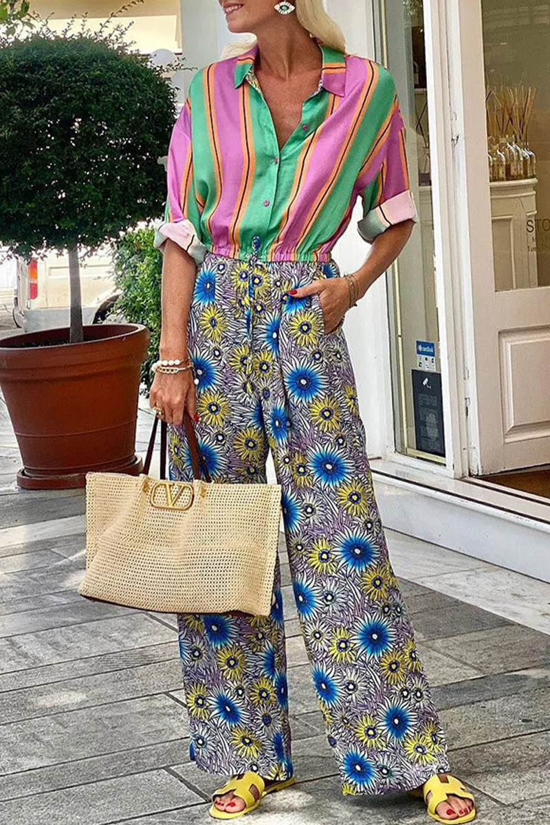 Casual Street Striped Print Floral Pocket Side Up Button-up Turn-up Collar Loose Jumpsuits (Monos sueltos)