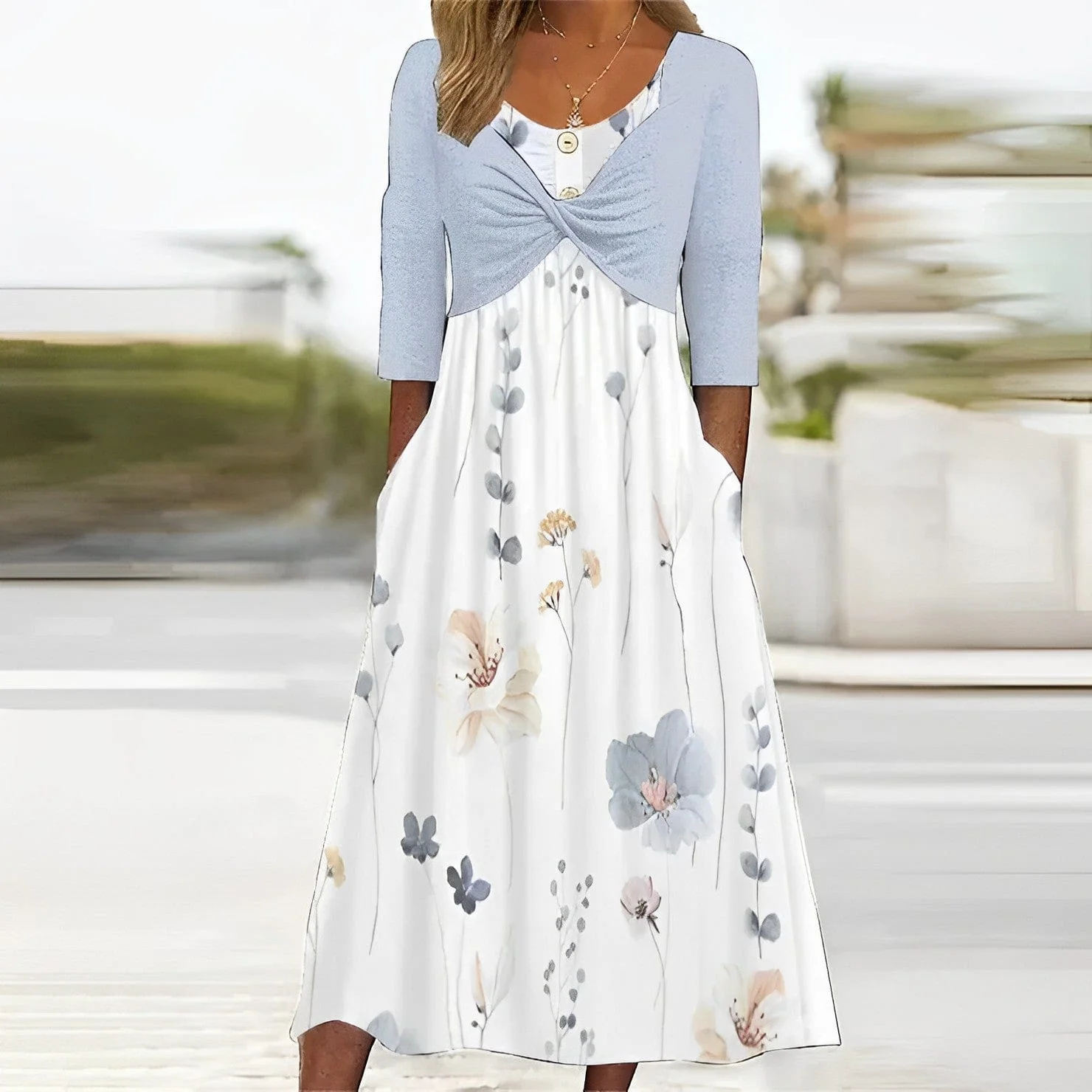 – Vestido azul con estampado